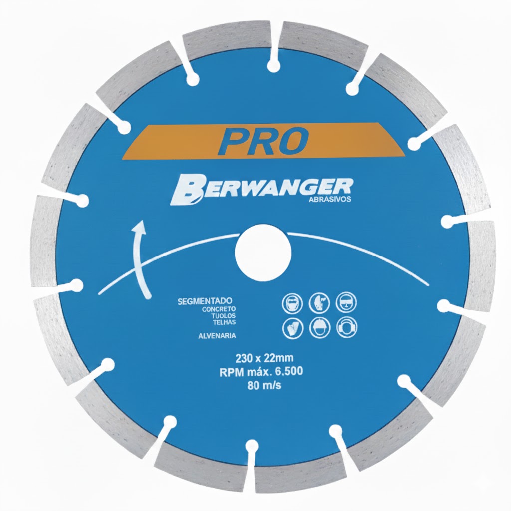 O Disco Diamantado Segmentado Berwanger 230 x 25,4 mm é projetado para o corte eficiente de materiais de construção brutos, como concreto, tijolos, telhas, blocos e alvenaria. Desenvolvido para uso profissional, proporciona alto desempenho, durabilidade e segurança em operações de corte pesado.